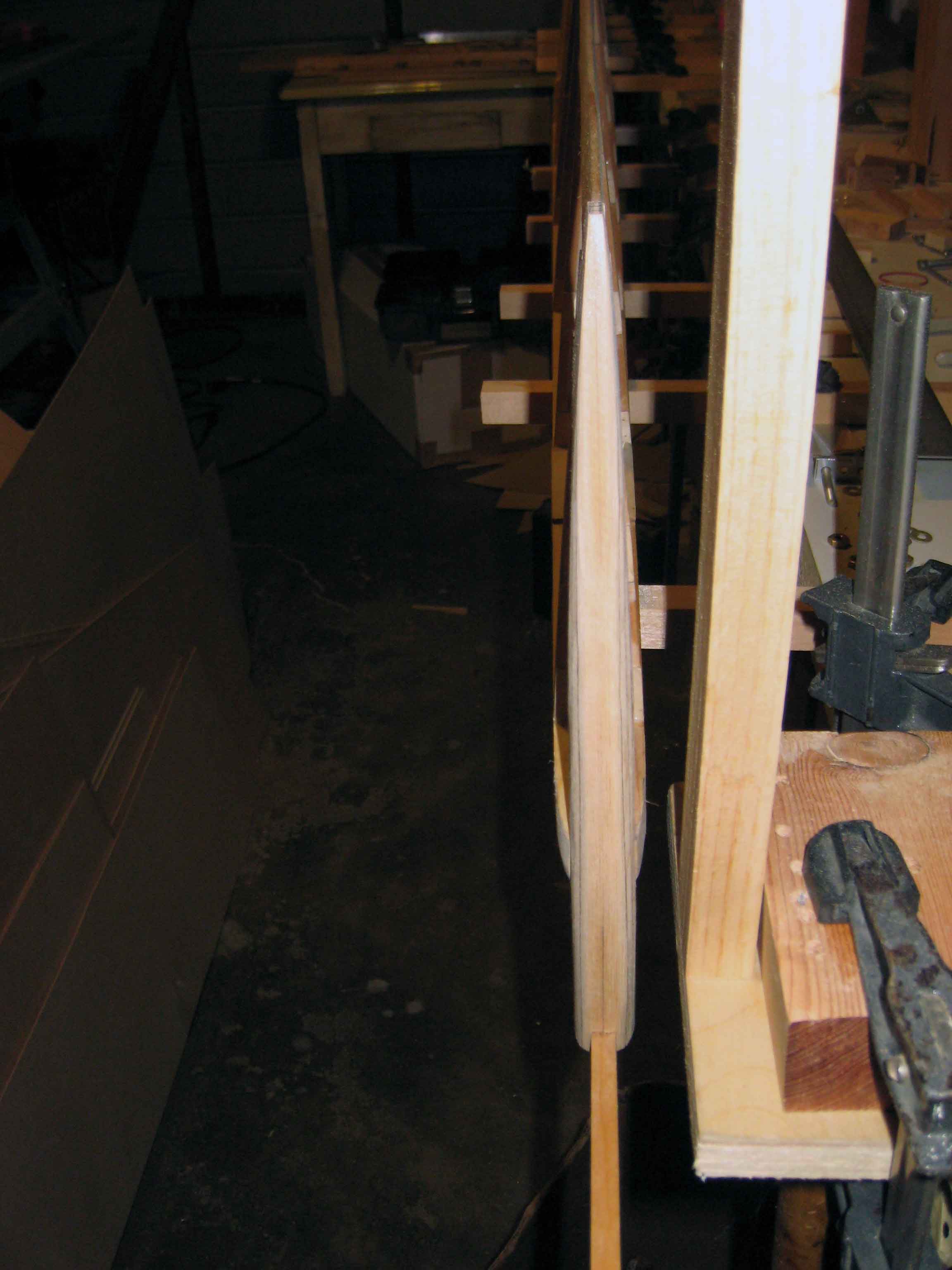 I drew the curve on the forward edge of the tip lamination and started carefully sanding with the stationary belt sander. The aft part of the tip becomes really skinny and the trick is to make the transition from the more rounded front as smooth as possible. Here's what I ended up with for now. I thing the middle parts will have to be skinnied up a bit and the aft end probably even skinner to match the station six rib a little bit. Not a bad rough start to get the skin on there to do the final sanding once the stabilizer and elevator are mounted together.