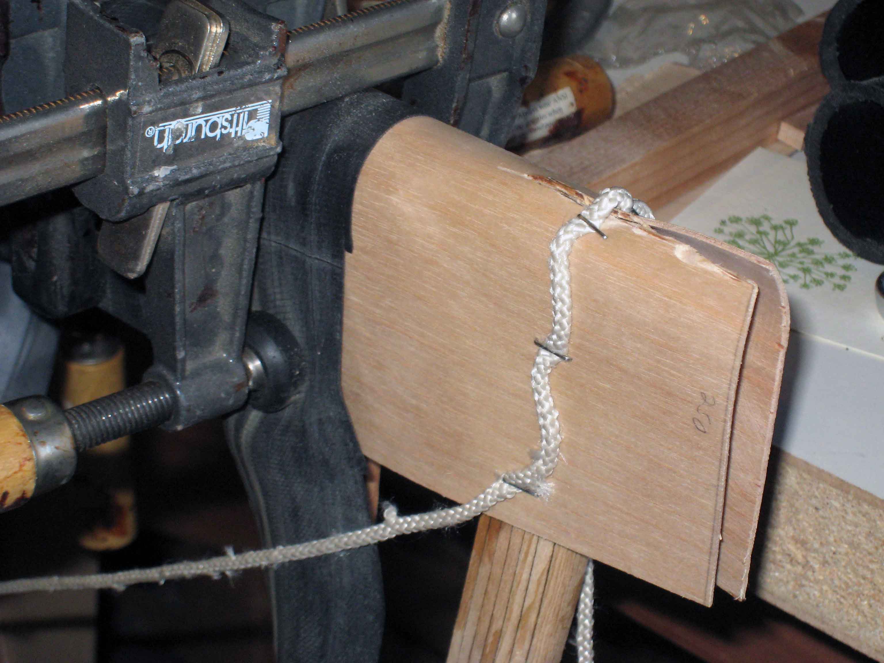 I've been soaking the outer leading edge elevator skins for a couple days now. These suckers were ready to bend! I bent them around and marked where the aft of the spar goes to trim off the extra so that I could use the innertube material to wrap around the spar. There are notes in the manual about what to do about the very tip. I pretty much followed the suggestion to cut the leading edge at the end where it puckers up from being pinched in, then stapling the skin there to close down on the tip bow. The skin doesn't need to wrap around the tip bow because everything will get cleaned up and sanded smooth and pretty after the elevator and stabilizer are done so that I get a smooth, matching wing tip. For now, here's the skin all bent in place for both sides. I'll probably let these sit here for a couple days.