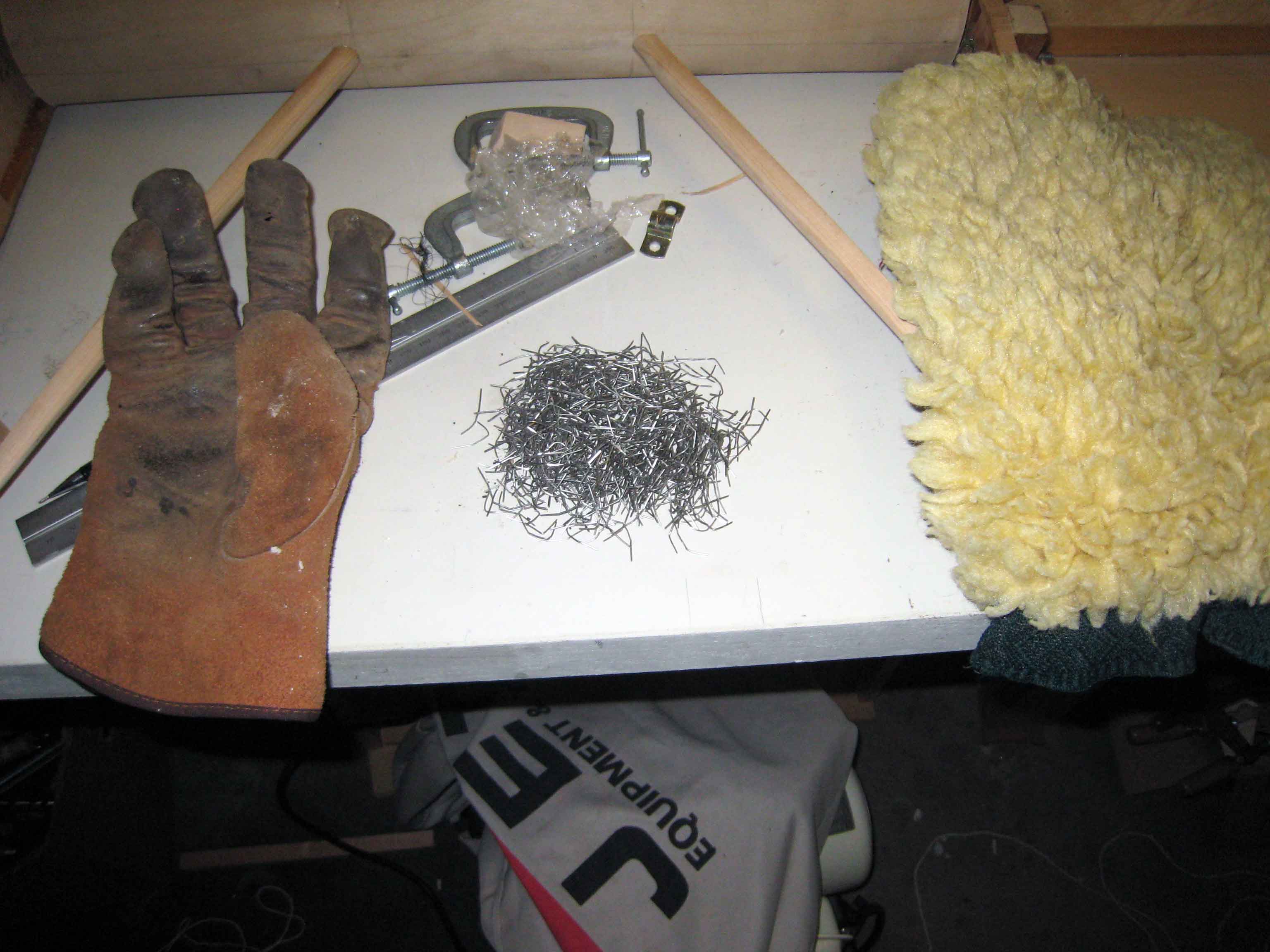 Here's the giant pile of staples I just pulled out one by one... The car wash glove on the right was the extra padding I used for pulling the string.