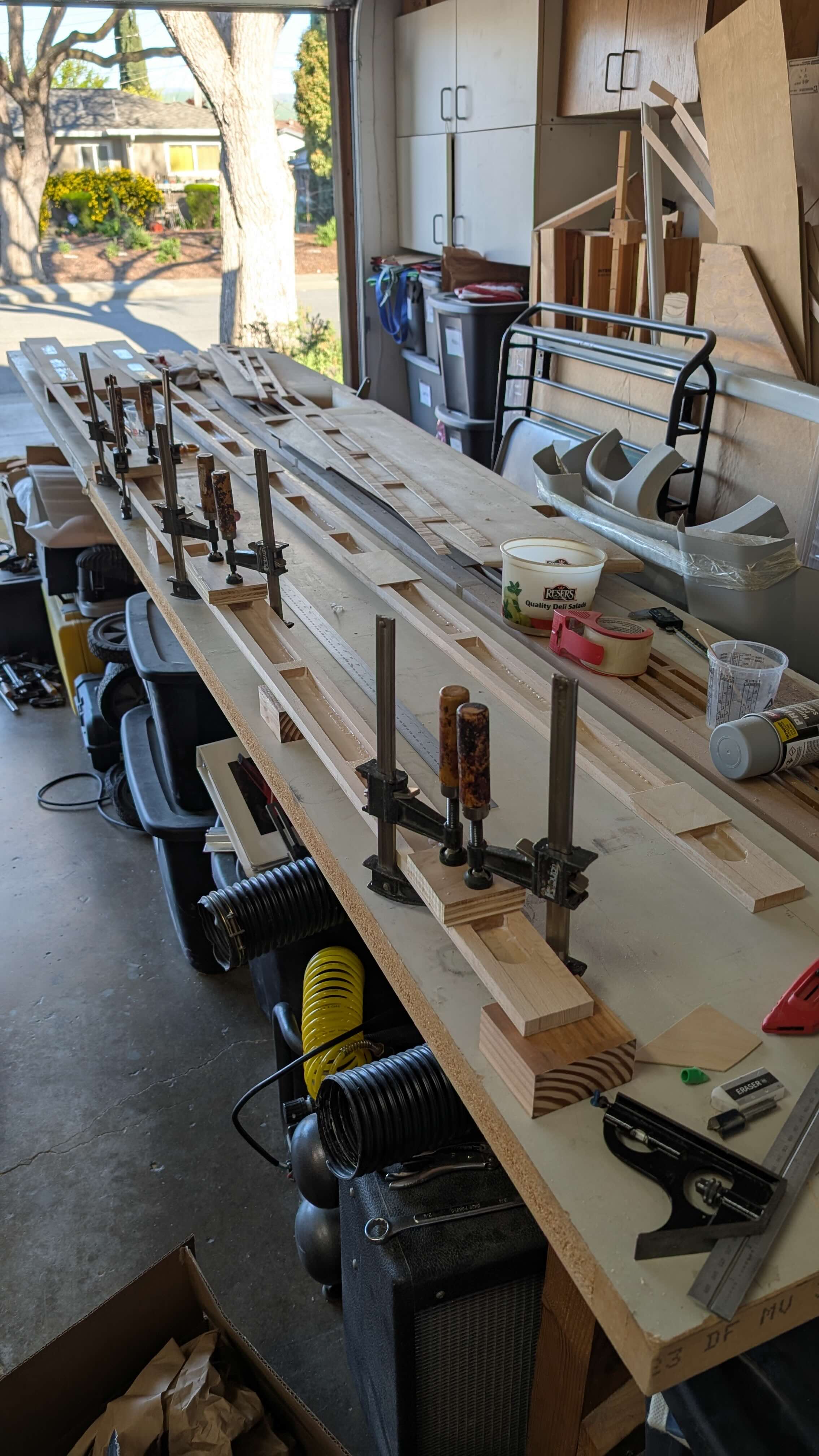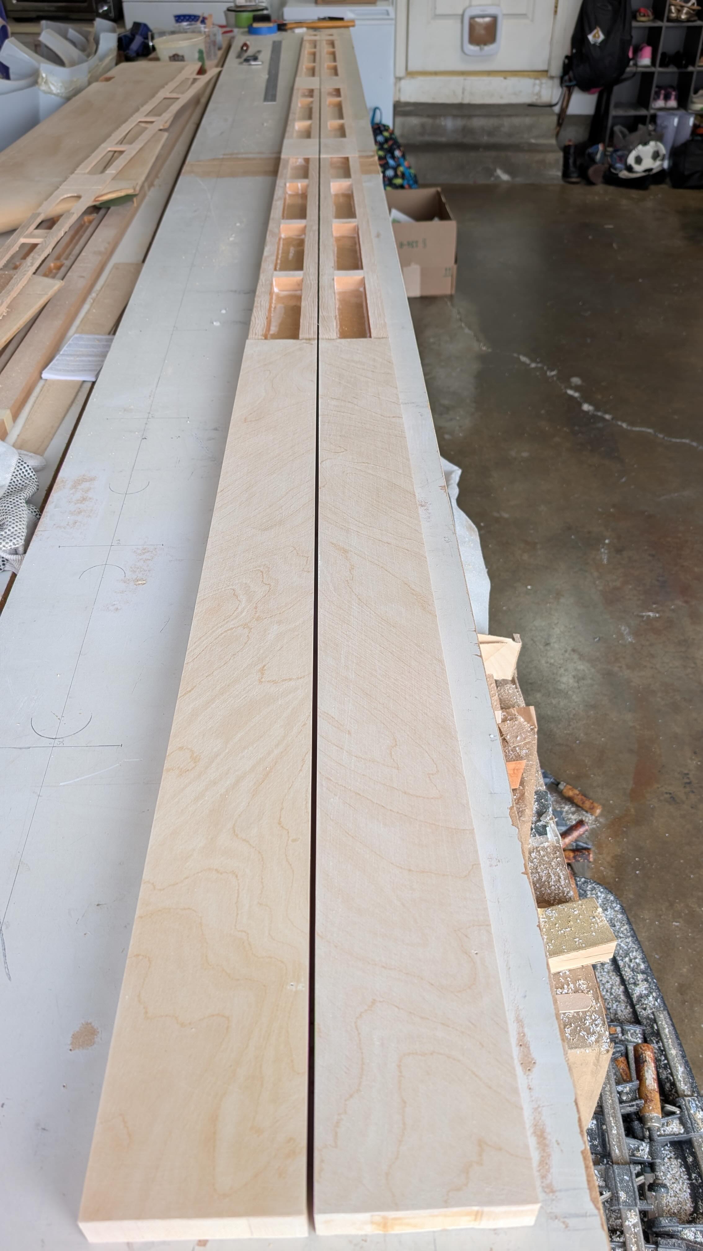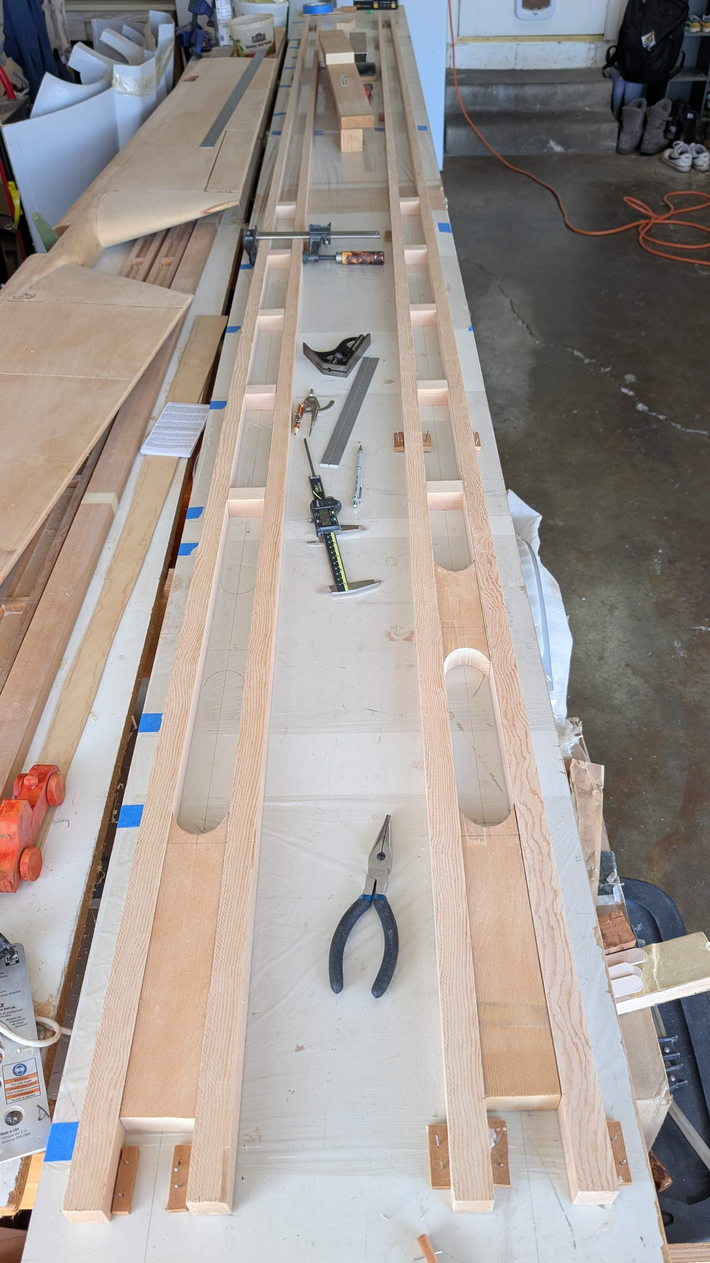 Here are the completed spars, ready for hinge alignment with the aileron/flap spars. But first, to the fin!