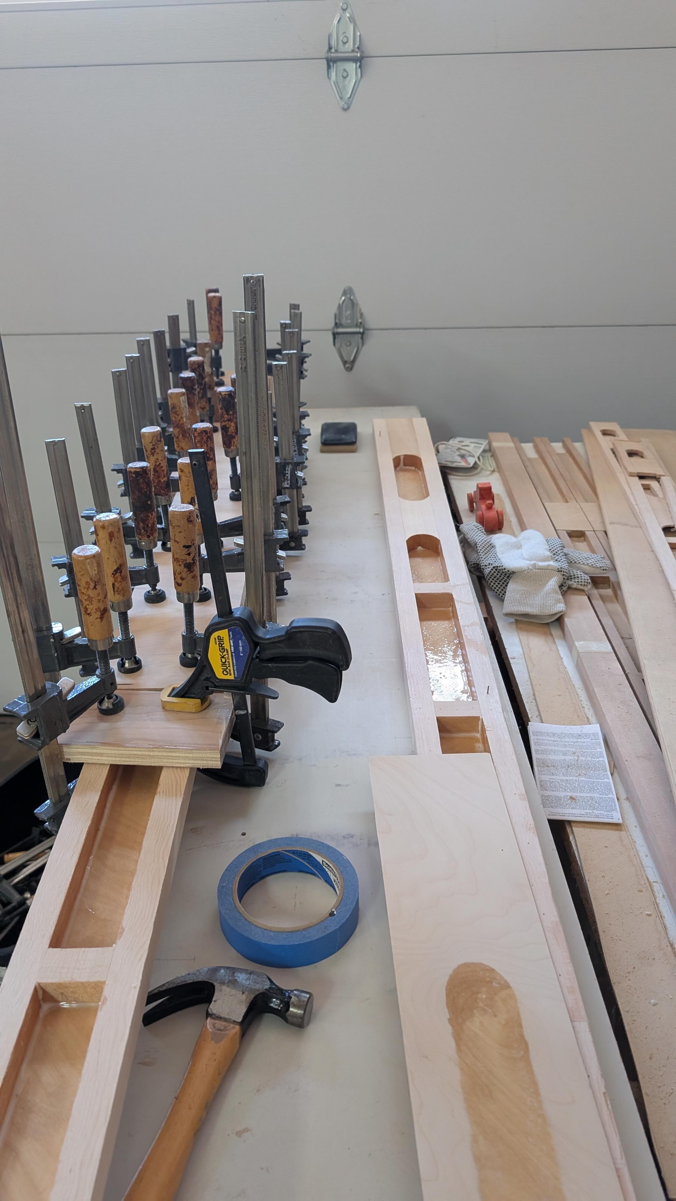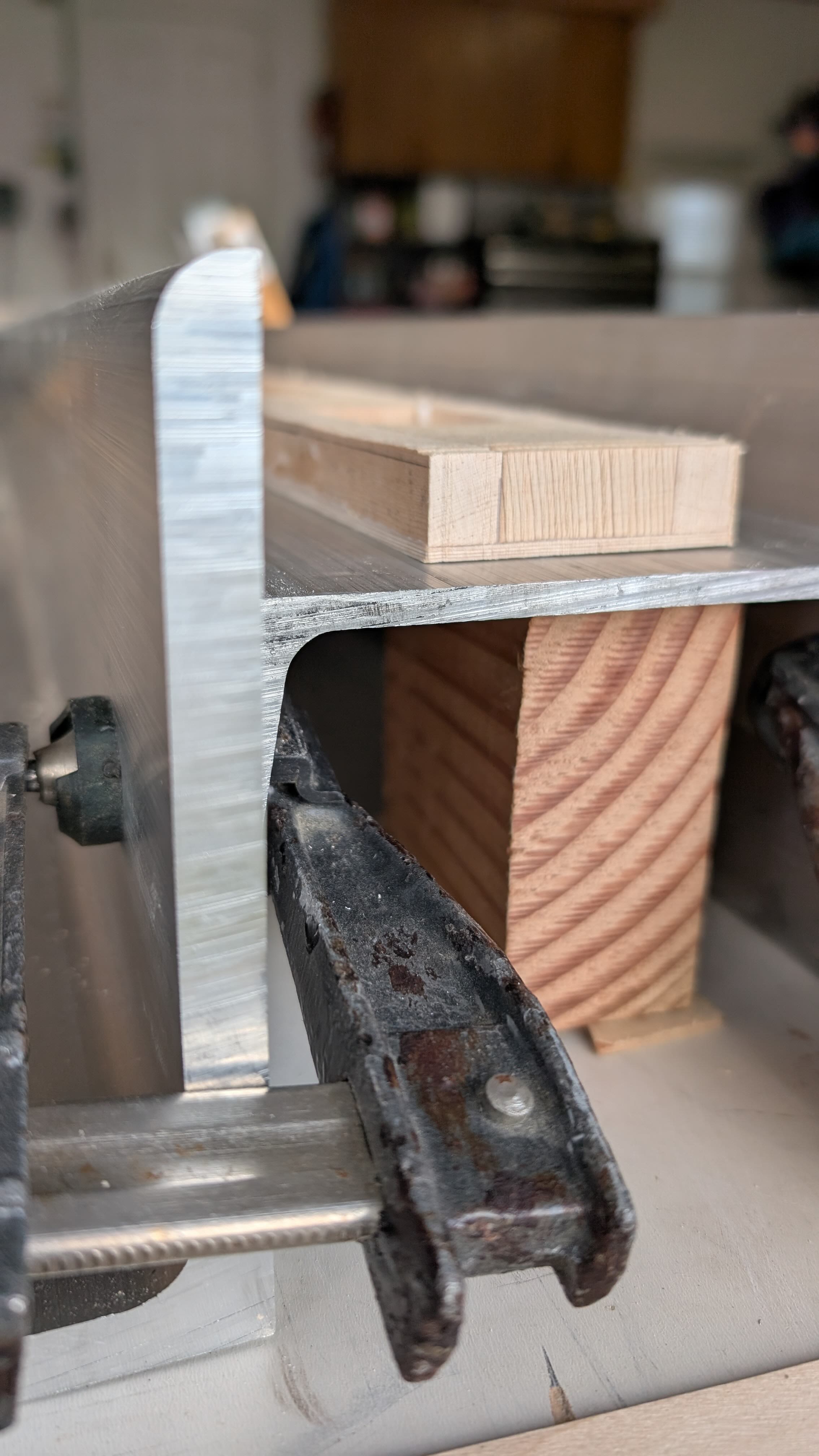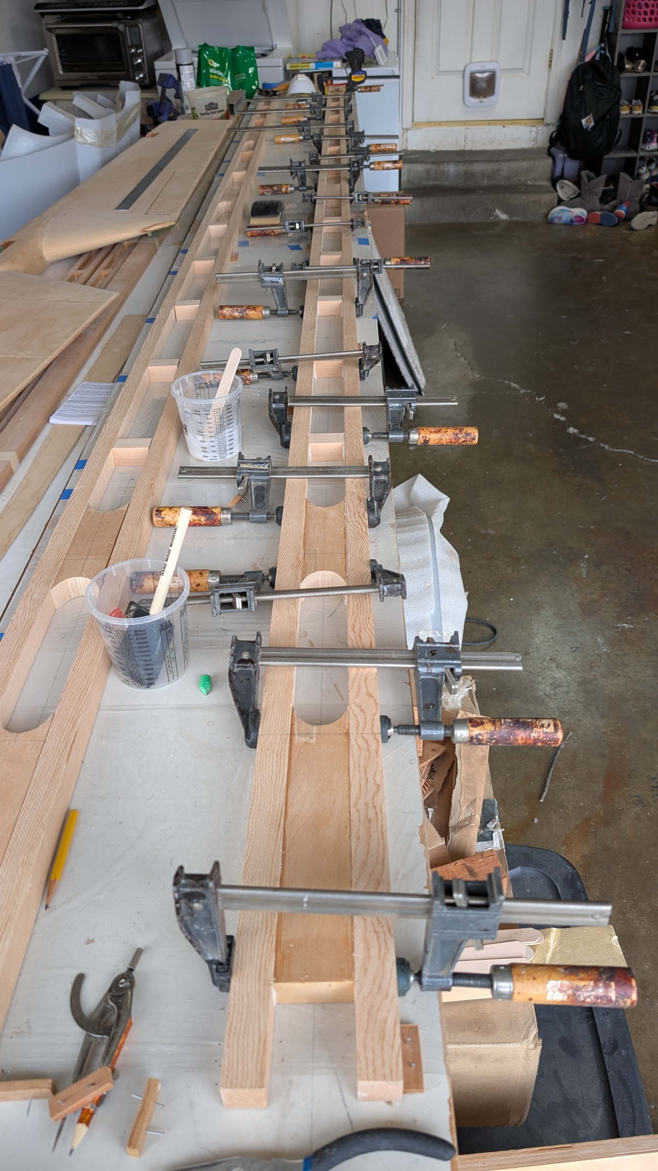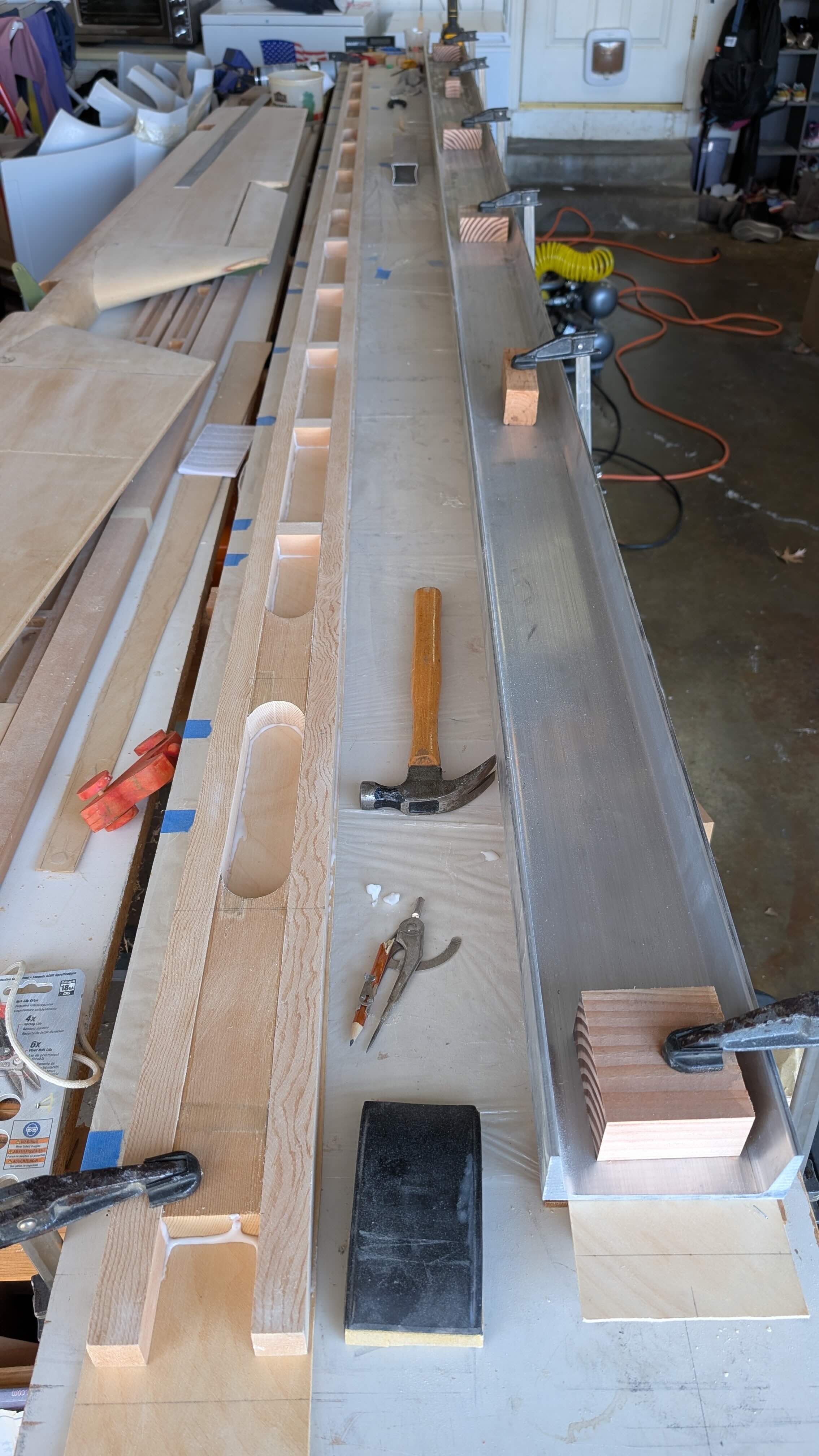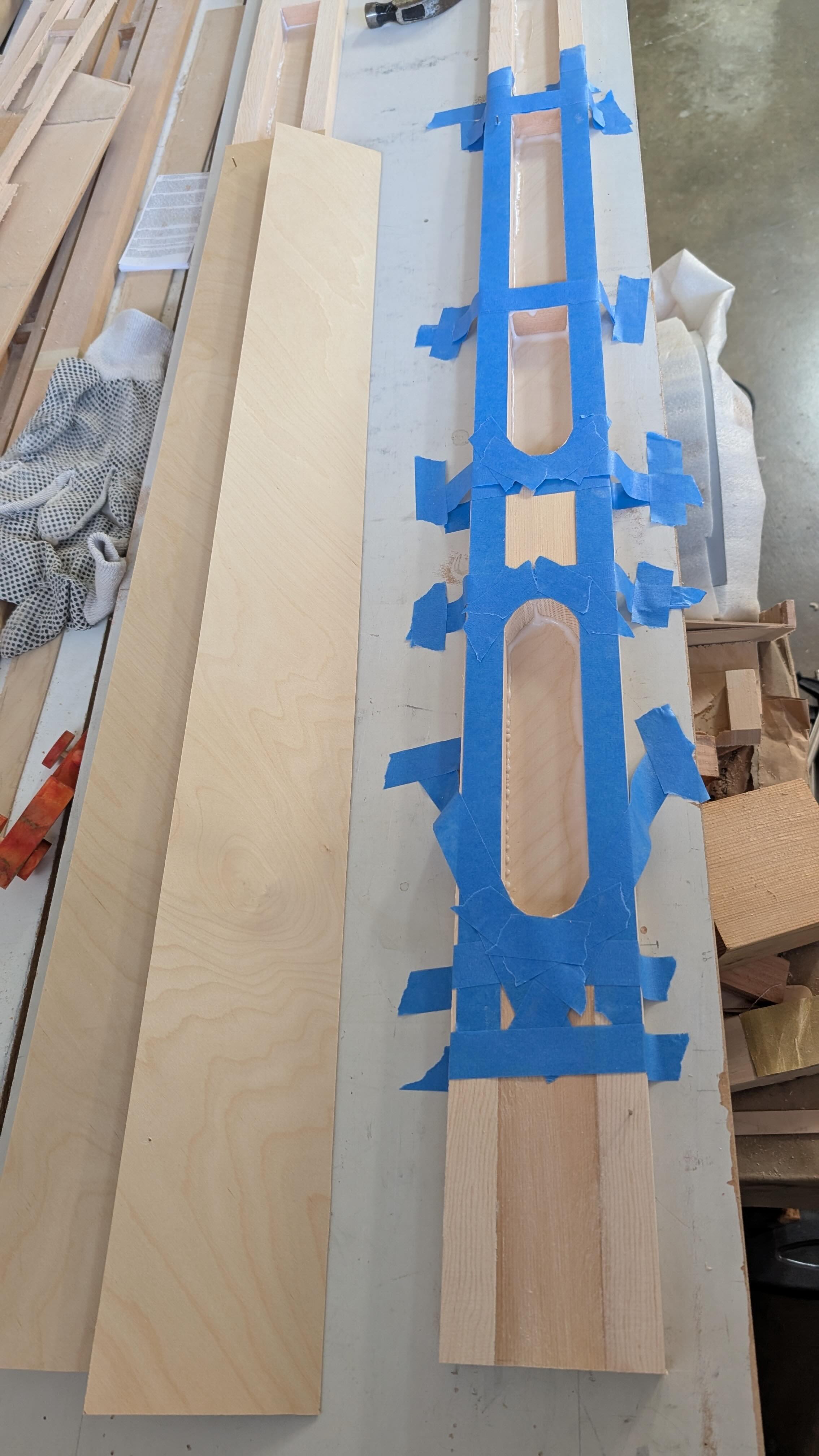 With the skin attached, I was then able to do the final tapering on the forward face of the spar, first the rough cut with the bandsaw (with assistance in holding the long spar), then using the router jig.