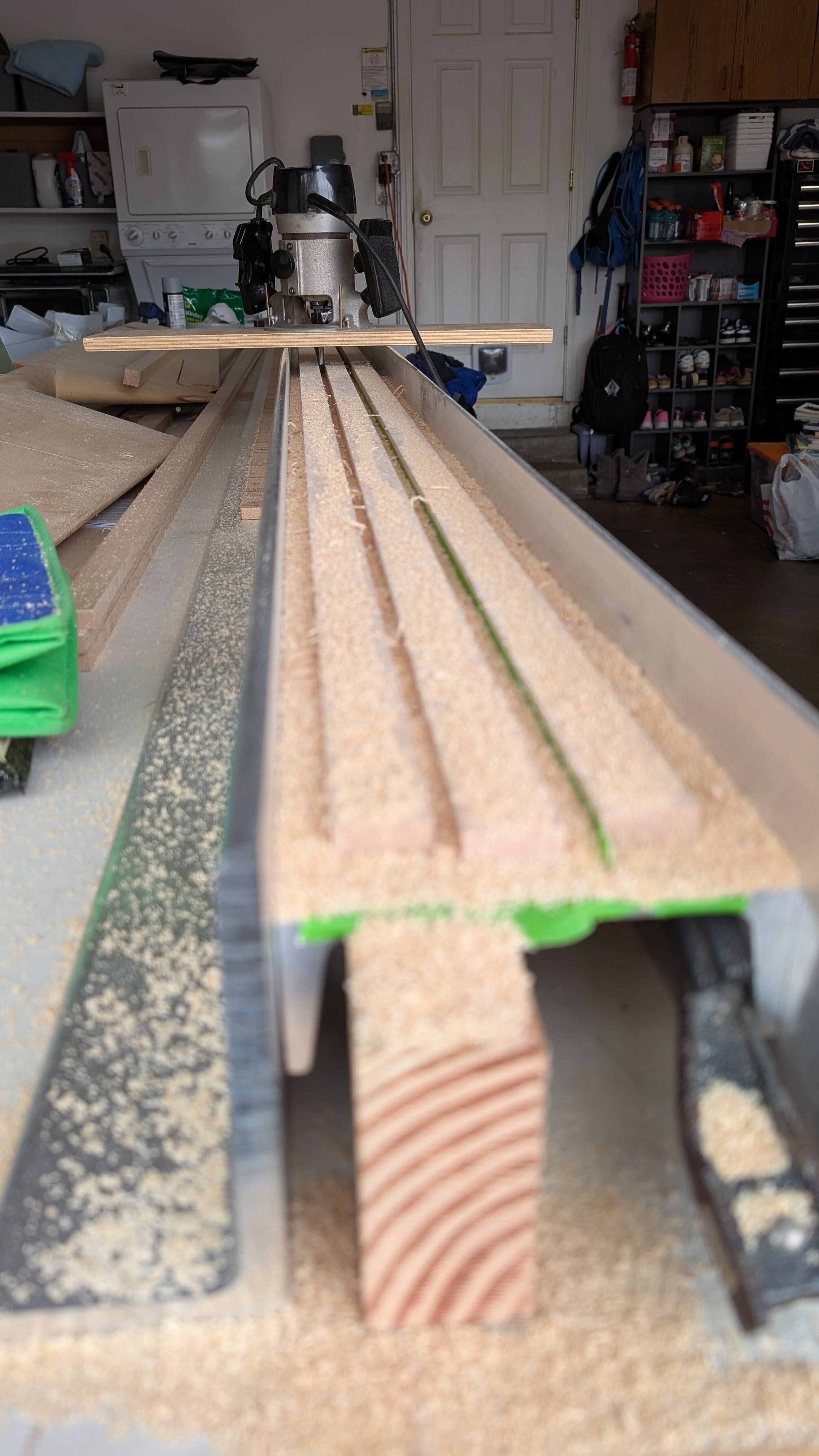This jig puts the wood at the exact angle of the taper to allow me to run the router over it to get a precise, clean cut. I had to obtain the 12 foot long spruce capstrips but I did already have all the wood for the blocking and plywood shear webs. I ordered the capstrips from Aircraft Spruce and Specialty and they provided some excellent quality wood.