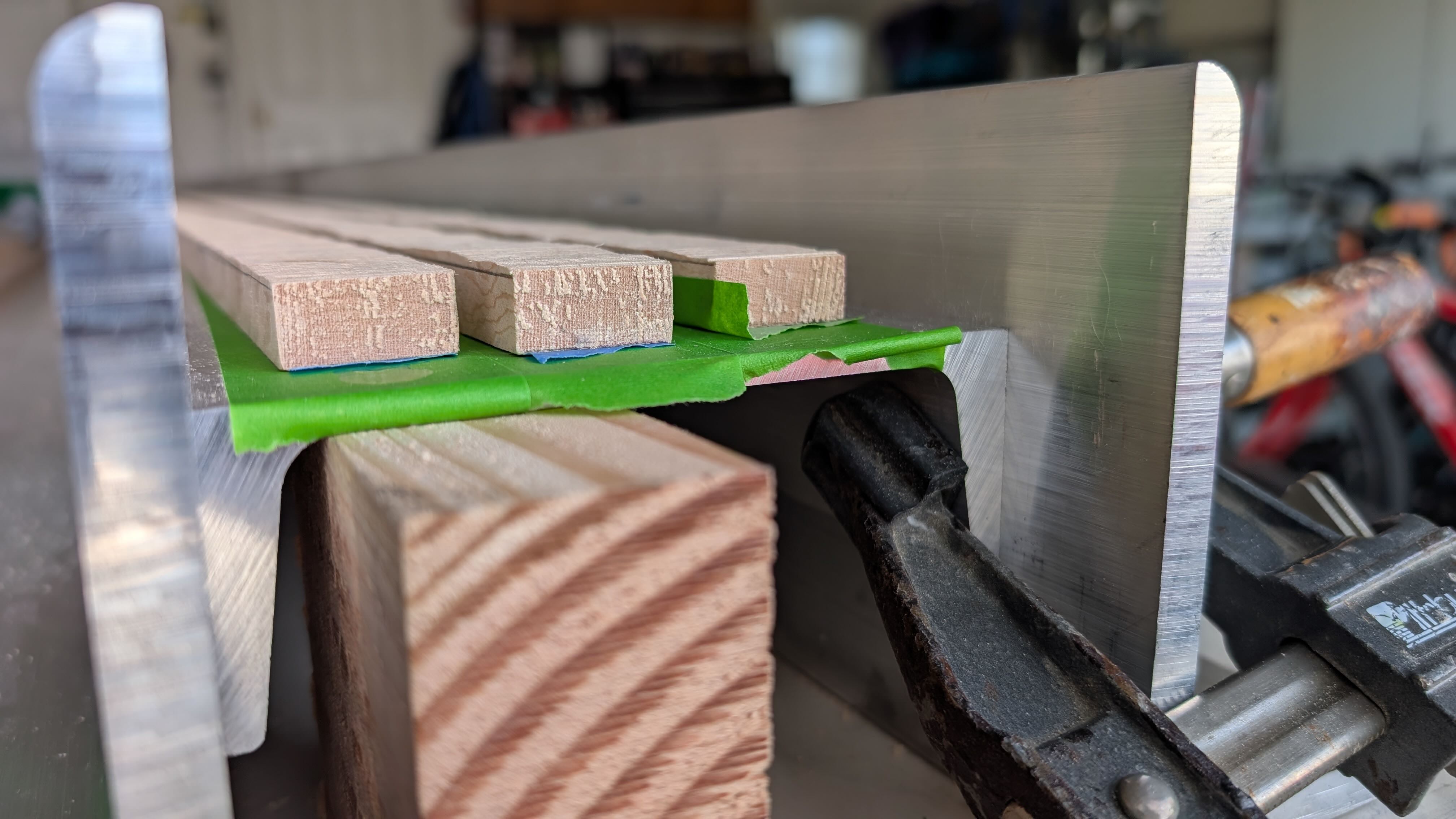 Since the captrips are tapered in two directions, going from a 25 mm square down to a 12 mm square from end to end, I made the first taper before I assembled the spar, then made the final taper after the spar was built. So the first step was to make one of the tapers on the inside face of the capstrips, which helps keep the wood grain parallel to where the airframe skin attaches to the spar.