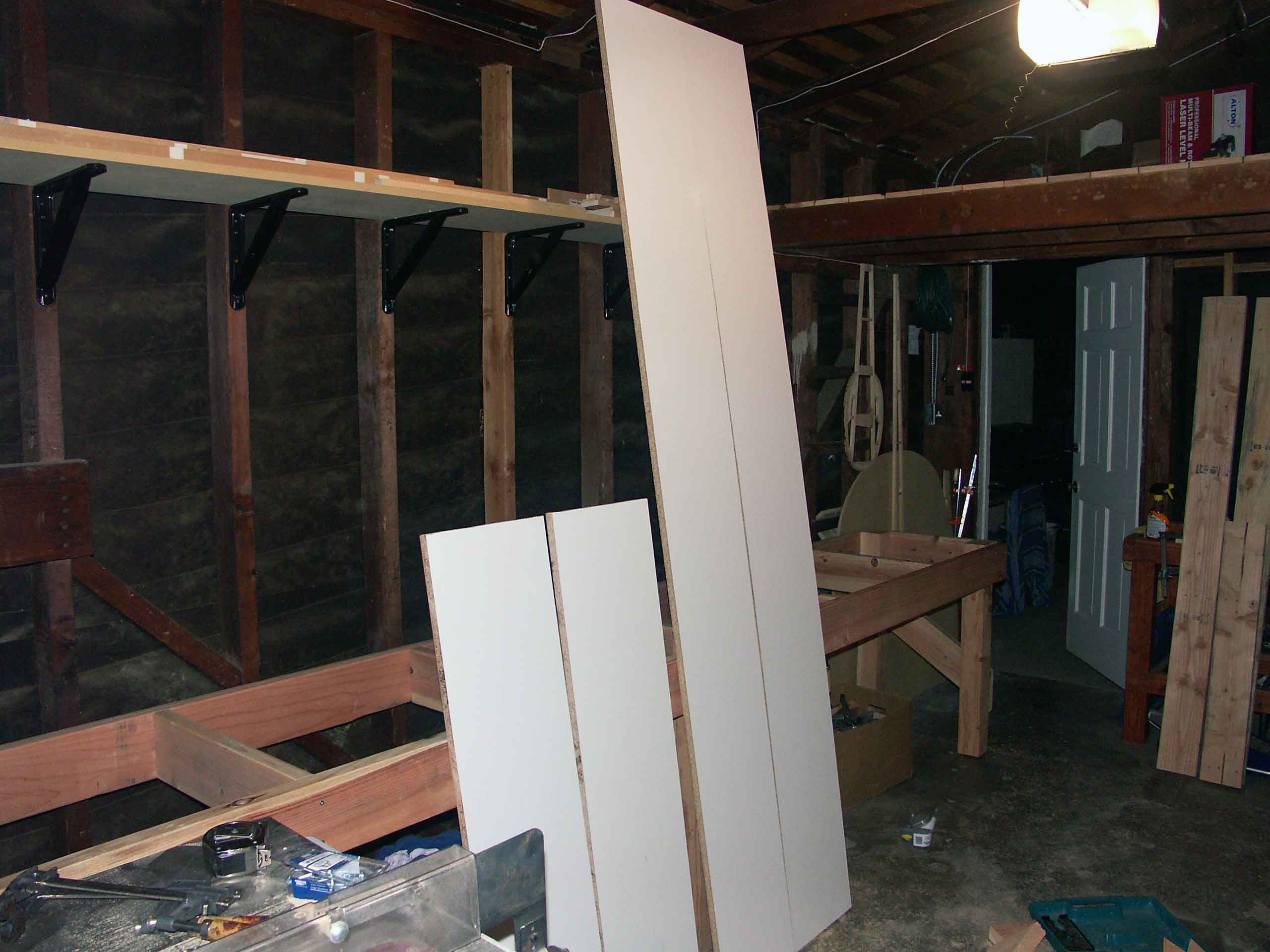 Today, I also cut up the 4'x8' sheet of melamine covered particle board that I'll be using for the table top. It took a bit of planning and help to manage such a large heavy piece on my relatively small table saw. I'm going to level the table and make sure the top structure is flat before I attach the table top.