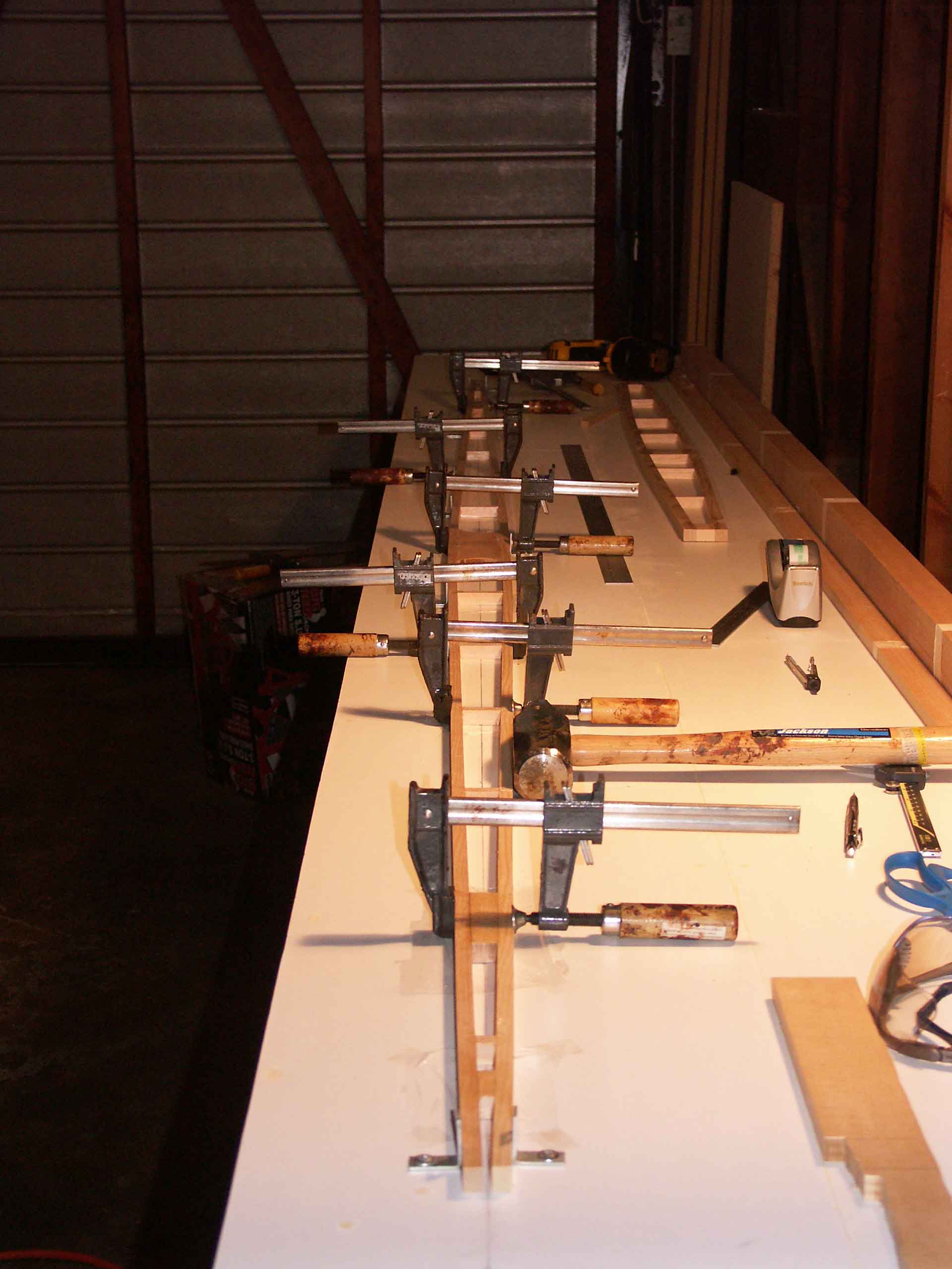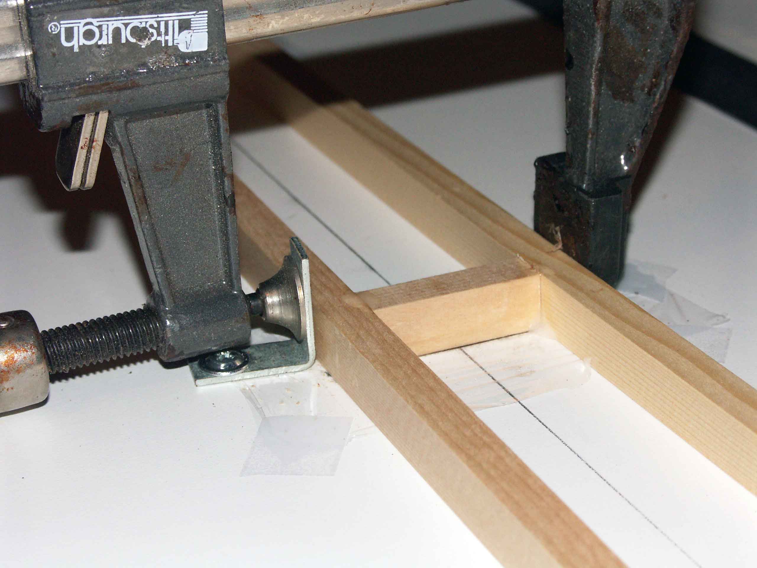 To keep the spar centered on the centerline along the length, I used the metal L brackets with clamps.
