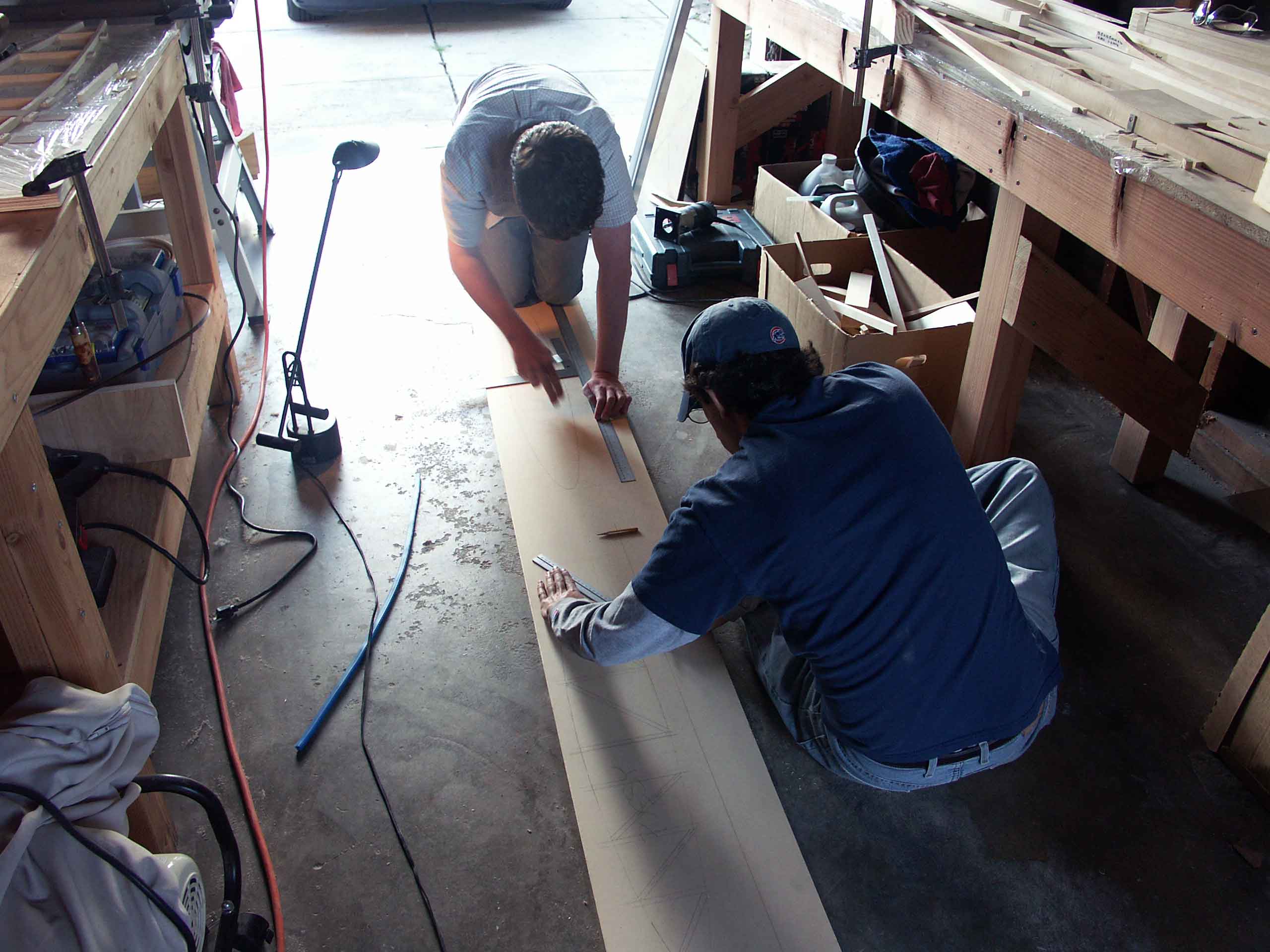 A couple of friends, Jon and Matt, expressed interest in helping me out so I gave them each the responsibility for a rib (or 2 by reusing the same jig). After some football and beer we went out to the garage and I walked them through making the jigs. They are working on the station 7 and station 8 ribs. Look at my slave laborers go.