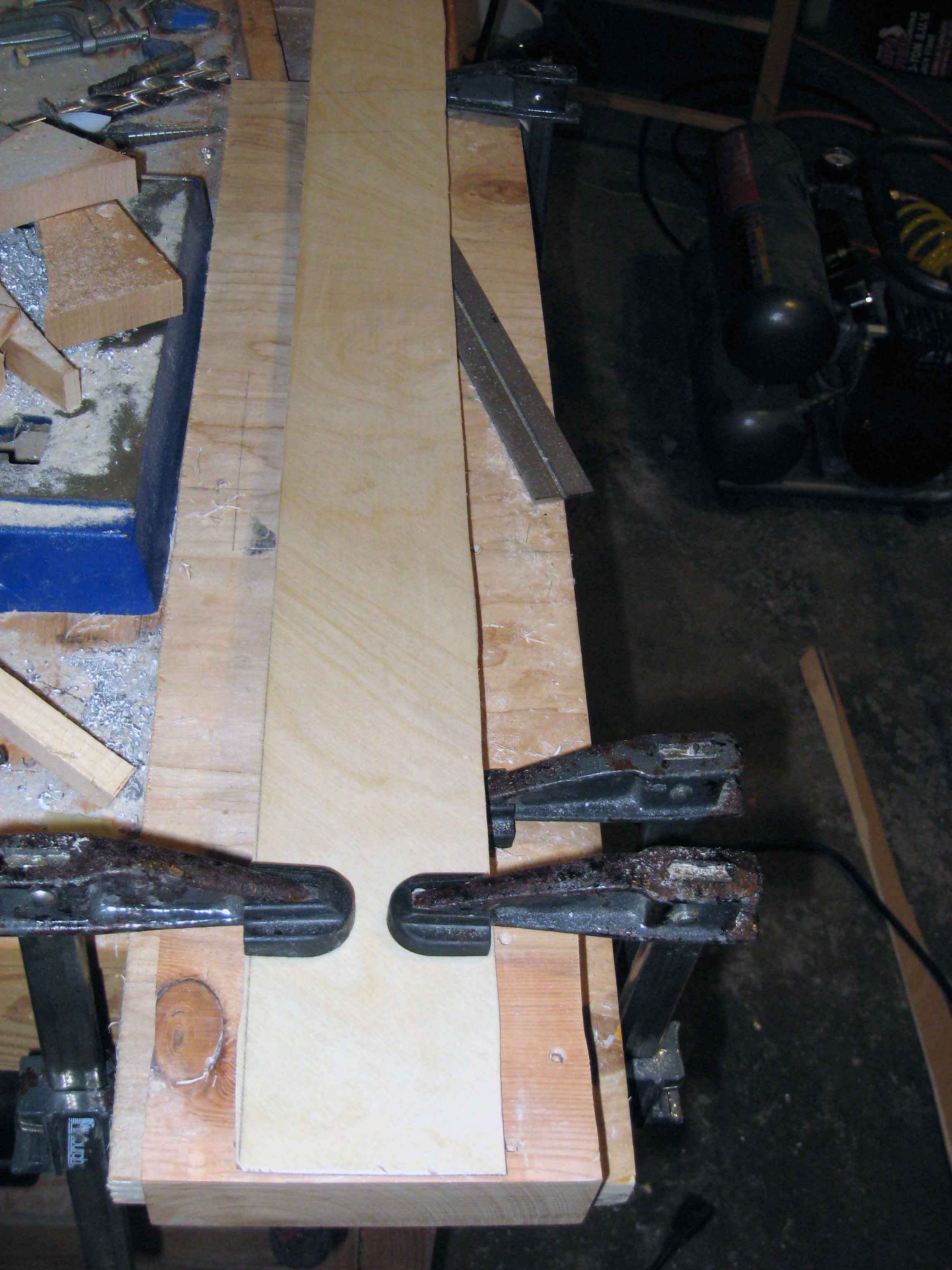 I've been pretty busy lately but I have only a few things to finish up before I start assembly. It's been a rainy, cold year so far so the aileron/flap spar has been sitting there ready to glue for almost two weeks. Tomorrow looks like a warm day and, being a Saturday, also one I have off from work. I want to glue the cover on the spar at the same time that I do the structure, so tonight I prepared the two halves so they would be ready to go for tomorrow. The cover grain is diagonal and there's a scarf joint in the middle because the spar is so long. I used my same laminate trimmer jig to make the 15:1 scarf.