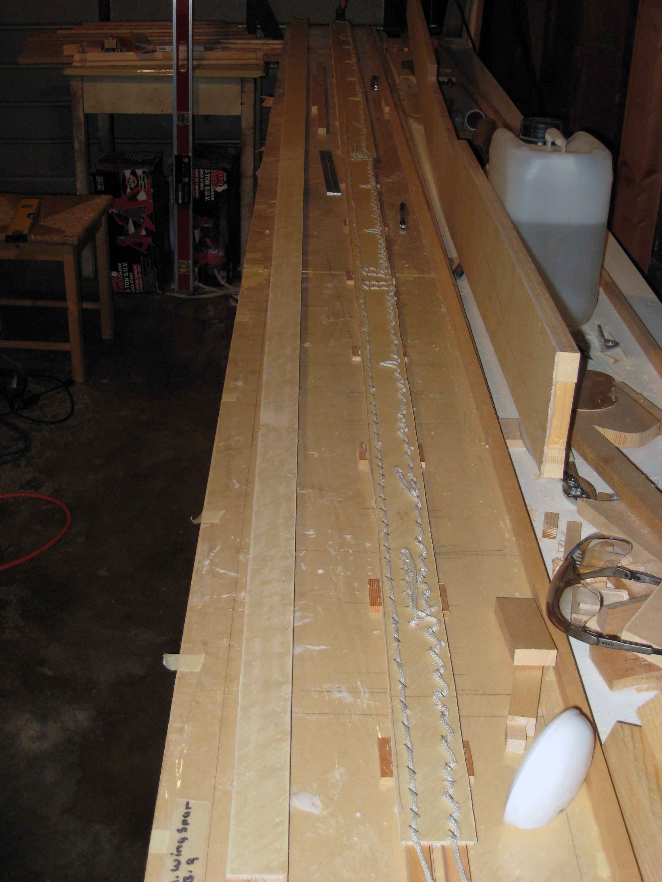 I glued down the second aileron/flap spar today. I had previously taken out all the staples and trimmed down the last one and pretty quickly did all the structure for the second one last Friday. I wanted to have it ready to glue in case there was a warm enough day. Today was just warm enough so off I went. Now that I'm done with all the wood parts, I need to get the garage ready for the tail assembly. The biggest part of that is to get a good solid flat and level surface to do assembly. So I'm going to clean up a bit and work on the table surface next. Here's the first one all trimmed up as well as the second on I just glued.